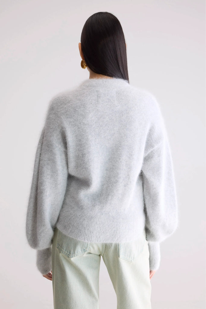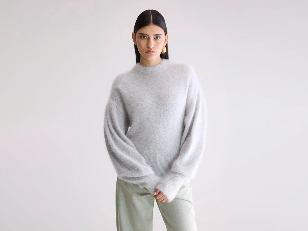 Zachte gebreide trui met ronde hals en lange mouwen, in een gebroken witte angoramix.